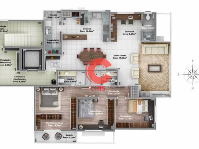 -APARTAMENTO CM O3 DORMS(SUITE COM VESTIR E SACADA), ESCRITORIO, LAVABO, CHURRASQUEIRA E SACADAS INTEGRADAS, final 01 com 149,12m2